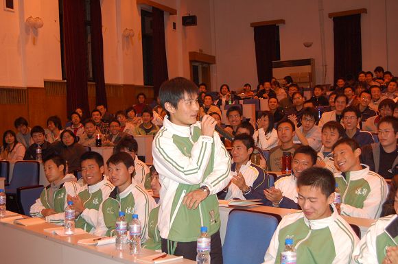 金志扬教授在报告中讲述了自己与北京理工大学合作的渊源,以及校足球队成长的历史与一些感人的细节,在北京理工大学足球队胜利冲甲的同时,他也完成了自己的“体育回归教育”的探索与实践,为中国足球事业的发展和大学生体育事业的发展都写下了浓重的一笔。金志扬教授用极具鲜明个性的语言和跌宕起伏的内心感受打动了在场所有听众的心,掌声一次又一次的热烈响起,为“金指”的人品、修养和敢于探索的精神喝彩!