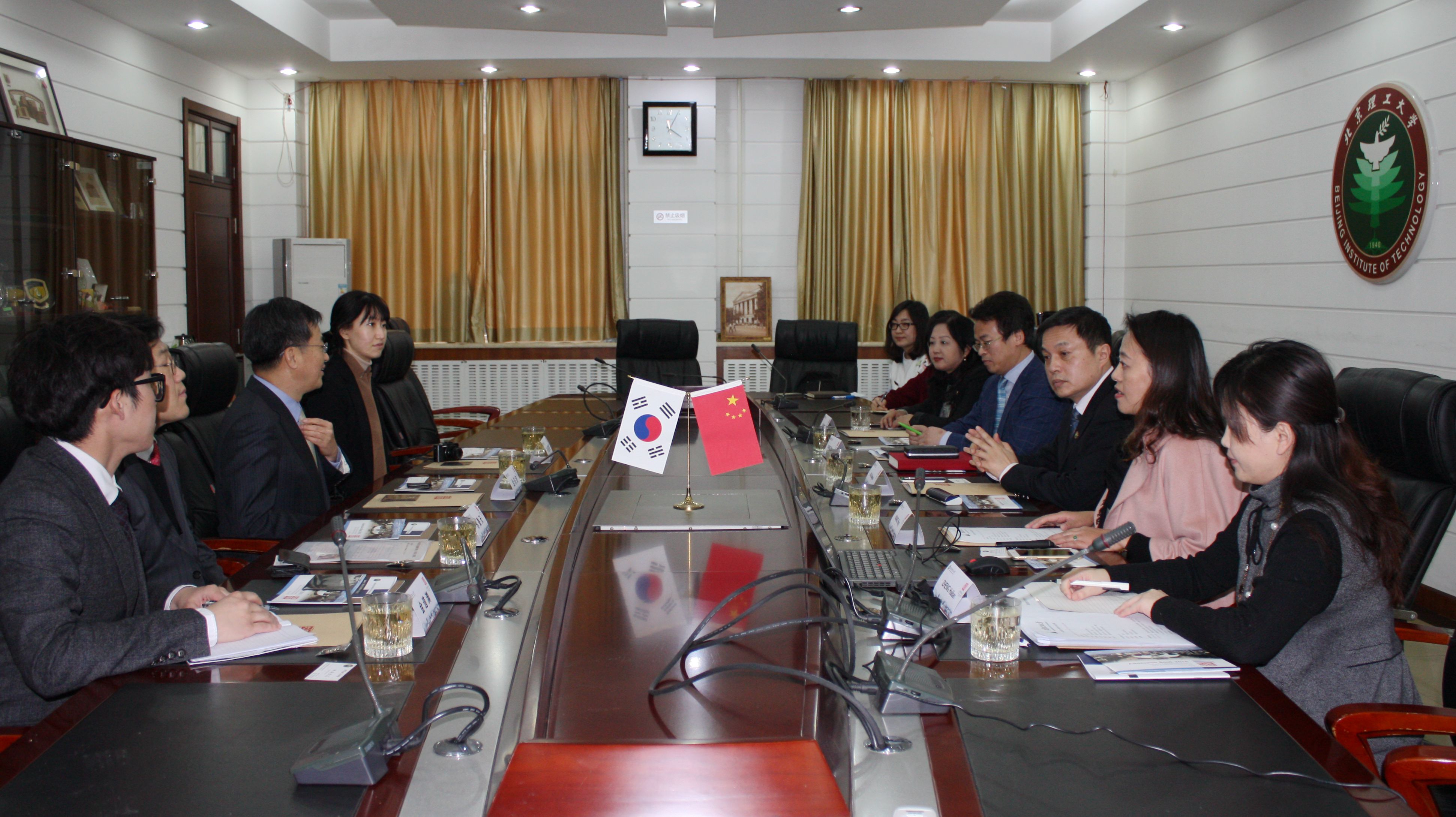 2016年1月20日下午,韩国亚洲大学校长金东兗一行四人访问北京理工大学,校长胡海岩在2号办公楼133会议室会见了客人。