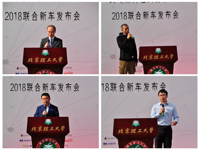北京理工大学党委副书记包丽颖,团委书记肖雄,北京学院院长张振华,宣传部副部长王征,教务部部长助理刘志兵,机械与车辆学院党委书记左正兴,中国大学生方程式系列赛事赛事总监陈刚,北汽新能源党委委员、副总经理李一秀,北汽新能源团委书记刘先,ARCFOX事业部整合营销科高级经理李京津,ARCFOX事业部整合营销科经理王新楷,上海禾赛光电科技有限公司销售总监樊星,北京九州华海科技有限公司销售经理马晓朋,北京耐威科技股份有限公司营销部总监杨建、营销部销售经理韩小军以及光明网、团中央新闻社、汽车之家车家号等媒体记者共同出席了发布会。发布会伊始,各位嘉宾为本次新车发布会致辞。首先,左正兴书记致开场词,他肯定了两支车队多年以来取得的成绩与创新突破表现,同时感谢学校各部门为大学生创新创业实践活动提供了源源不断的支持和帮助,感谢战略合作企业的大力资助,最后表达了对队员们在2018赛季中取得更好成绩的殷切期盼。随后,陈刚总监在致辞中赞扬了多年来北京理工大学在大学生方程式赛车项目上 “敢为人先,不断突破”精神,更是希望通过方程式赛事平台,为中国汽车行业输送一批批优秀的行业领袖。之后,李一秀副总经理宣布了北汽新能源ARCFOX品牌正式冠名赞助北京理工大学纯电动方程式赛车队的决定,并且希望通过校企合作,积极承担社会责任,引导更多优秀学子投身汽车行业,共同推动中国新能源汽车行业不断向前突破。最后,北京理工大学无人驾驶方程式赛车队赞助商代表,上海禾赛光电科技有限公司销售总监樊星在讲话中感谢了北理工在校企合作中提供的帮助,并激励队员在新赛季勇创佳绩,为荣誉而战。