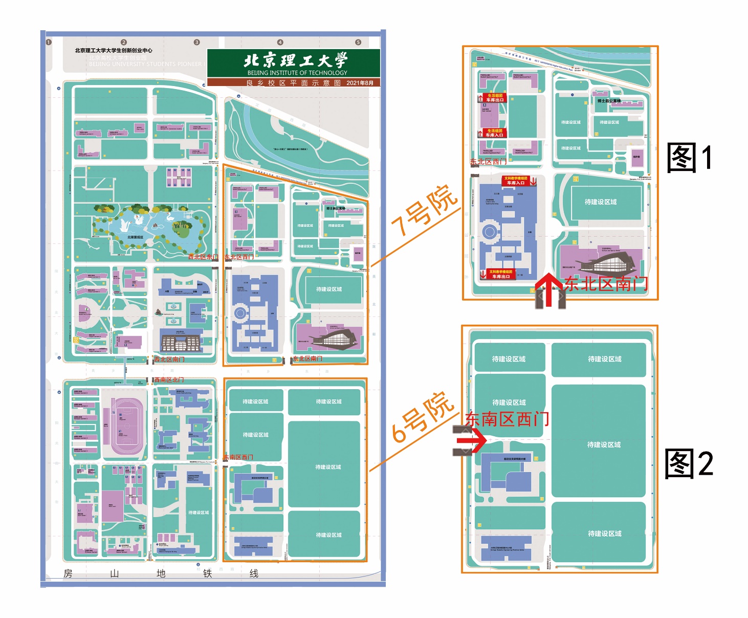 2. 良乡校区东南区(良乡东路6号院)开放西门进出,南门和北门暂时关闭。(位置如图2所示)
