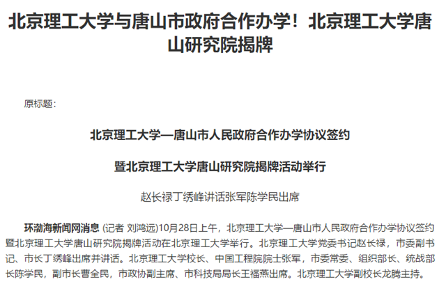 编辑:吴楠 审核:王征 阅读次数:原文标题:北京理工大学与唐山市政府合作办学!北京理工大学唐山研究院揭牌
