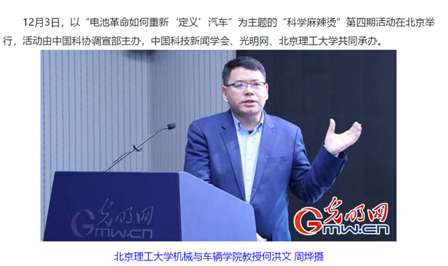 12月3日,以“电池革命如何重新‘定义’汽车”为主题的“科学麻辣烫”第四期活动在北京举行,活动由中国科协调宣部主办,中国科技新闻学会、光明网、北京理工大学共同承办。