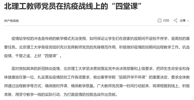 疫情给学校的冲击是传统的教学模式无法使用,如何保证让学生们在居家抗疫期间不返校不停学,是高校的重要任务。北京理工大学各级党组织充分发挥教师党员的先锋模范作用,积极做好疫情防控期间远程教学工作。抗击疫情,千里之遥,上好“四堂课”。