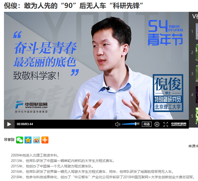 【中国财富网】倪俊:敢为人先的“90”后无人车“科研先锋”