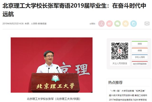 【人民网】北京理工大学校长张军寄语2019届毕业生:在奋斗时代中远航