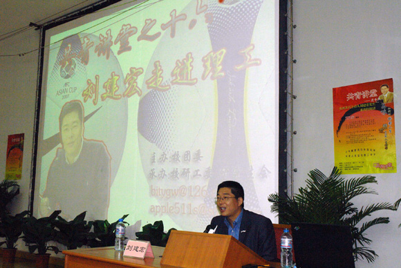 刘先生首先回忆了学生时代和北京理工大学的一些接触,一下子拉近了与观众的距离。他说,他不喜欢居高临下的讲座,喜欢面对面的交流,与其讲述自己的心路历程,倒不如面对面地交谈。同学们立刻兴奋起来,他们心中有着很多有关于中国足球的问题,需要刘先生解答。