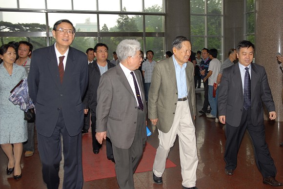 上午9:30,在师生们热切的盼望中,杨振宁先生来到中心教学楼一层报告厅,校党委书记焦文俊教授,副书记、副校长杨宾教授会见了杨振宁先生,并在贵宾室就科技与教育进行了会谈。