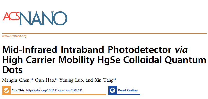 北京理工大学光电学院郝群教授团队成员陈梦璐准聘教授、唐鑫教授在《ACS NANO》期刊上发表了题为“Mid-Infrared Intraband Photodetector via High Carrier Mobility HgSe Colloidal Quantum Dots”的文章,利用低成本胶体量子点导带中1Se到1Pe的能级跃迁,实现低成本中波红外带内跃迁探测。
