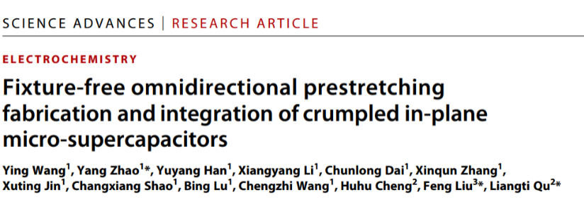 5月27日,北京理工大学化学与化工学院博士研究生王赢以第一作者身份在Science Advances期刊发表题目为“Fixture-free omnidirectional prestretching fabrication and integration of crumpled in-plane micro-supercapacitors”的研究论文。北京理工大学为第一通讯单位,北京理工大学化学与化工学院赵扬特别研究员、清华大学化学系曲良体教授和中国科学院力学研究所刘峰副研究员为共同通讯作者。本研究得到了国家重点研发计划项目、国家自然科学基金和北京市自然科学基项目等支持。