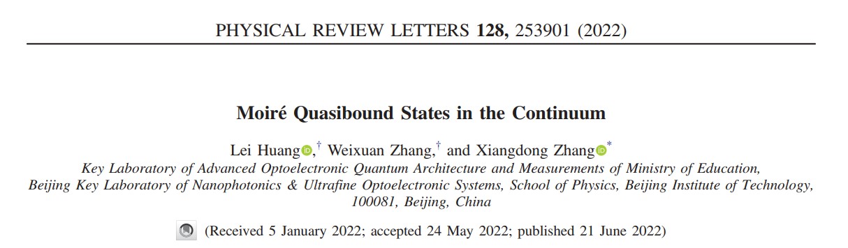 日前,北京理工大学物理学院张向东教授课题组,在基于moiré光子晶体板的连续谱束缚态研究方面取得重要进展。相关研究成果发表在近期的Phy. Rev. Lett. (128, 253902 (2022))上。研究工作得到了国家自然科学基金委和国家重点研发计划的资助。北京理工大学物理学院黄磊博士(2021级)和张蔚暄博士(现集成电路与电子学院特立博士后)为论文的共同第一作者。