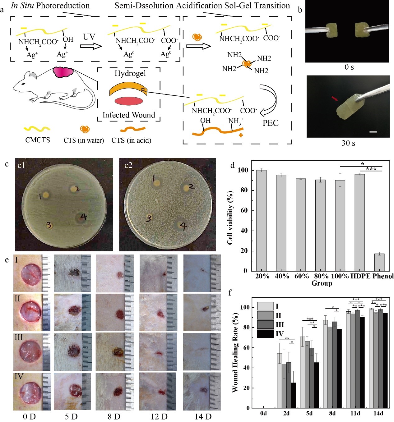 图4. CTS/CMCTS/AgNPs水凝胶制备及应用。(a)SD-A-GT形成机理;(b)自愈合30s水凝胶能够支持自身重量;(c)抗菌性能,c1为金黄色葡萄球菌,c2为铜绿假单胞菌;(d)细胞相对增值率;(e)铜绿假单胞菌感染伤口的闭合性,Ⅰ为CTS/CMCTS/AgNPs水凝胶敷料,Ⅱ为CTS/CMCTS水凝胶敷料,Ⅲ为夫西地酸乳膏对照组,Ⅳ为空白对照组;(f)不同敷料的伤口闭合率