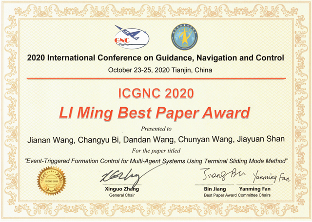 国际制导、导航与控制学术会议(ICGNC)是目前中国最大的航空、航天、航海、陆地等运动体制导、导航与控制(GNC)领域的国际学术会议,每两年举办一次,已经成功举办8届。本届会议于10月23日至25日在天津举行,邀请了包为民院士、陈志杰院士和苏东林院士分别作制导、导航与控制相关的大会报告。会议共收到811篇论文,经过严格评审最终共616篇文章被收录。李明最佳论文奖是2014年由中国工程院院士李明出资设立,旨在奖励45岁以下的优秀青年科技工作者,鼓励国内外更多的青年人投身于制导、导航与控制的前沿性学术研究和关键性技术创新,每届不超过1名,截止2020年,共7人获奖。