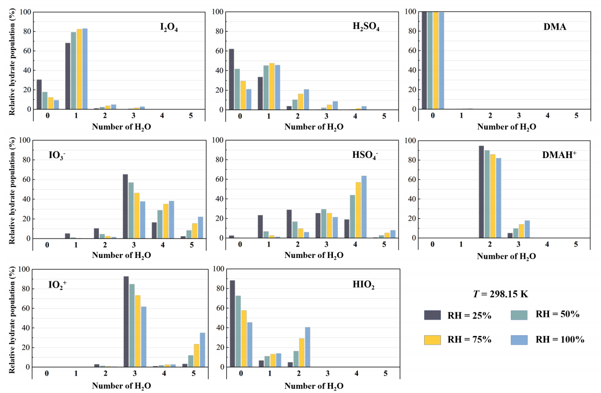 北京理工大学张秀辉教授团队及其合作者通过量子化学计算与第一性原理分子动力学模拟相结合的方案揭示的大气中硫酸和胺类物质影响下的I2O4的气-液界面(即液相气溶胶表面)上的非均相反应机制则较好地解释了上述分歧问题。由于真实大气中的化学组分远比“单纯”的实验环境更为复杂,除碘氧化物外,还存在着污染物硫酸、以及海洋类生物排放生成的胺类组分。她们合作研究发现,在硫酸和有机胺的参与下,I2O4可在气溶胶气-液界面快速(皮秒级别)反应(图1)生成亚碘酸HIO2以及一系列离子产物,如HSO4-、IO3-、DMAH+等。所生成的反应产物间可通过氢键、卤键和离子键结合为尺寸更大的复合物,进而限制其向液滴体相的扩散;同时,界面水分子通过氢键与产物分子结合,使其难以蒸发至气相(图2)。且上述附着于液滴表面的产物(IO3-/DMAH+等)相比于反应物(I2O4/DMA等)有更低的挥发性和更高的吸湿性(图3),还可促进气溶胶的吸湿性增长。