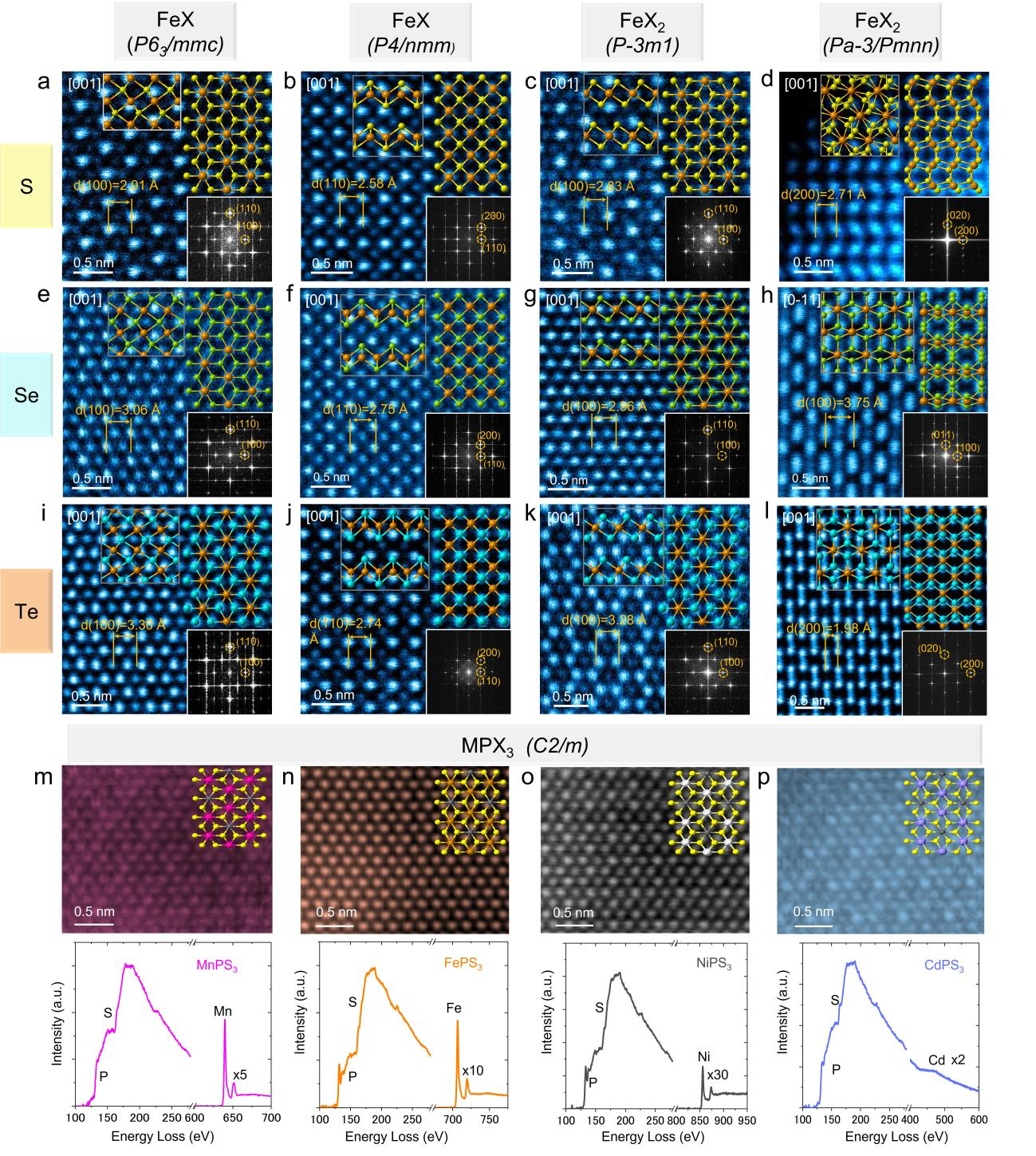 根据实验和模拟Z-contrast STEM图像、EDS mapping和EELS结果综合分析,制备所得的大部分铁基硫族化合物和TMPCs属于5个不同的空间点群,可划分为5类:(1)P63/ mmc (非层状六方/三角形FeX);(2) P4/ nmm (层状四方FeX);(3) P3 ̅m1(六边形/三角形/梯形的层状FeX2);(4) Pa3 ̅(非层状FeS2纳米线)和Pmnn(非层状FeS2和FeTe2纳米线);(5) C2/m (MPX3, M = Mg, V, Cr, Mn, Fe, Co, Ni, Ag, Cd或Zn)。以MPX3为例,从结构上看,单层MPX3的元胞由一个哑铃状P2X6和两个M原子组成,形成每个M原子与6个X原子配位,每个P原子与1个P和3个X原子配位的蜂窝状结构。当沿垂直方向堆叠时,MPX3层之间的面间位移打破了三重反转旋转对称性,产生了一个属于C2/m空间群的单斜晶格。STEM-ADF图像沿[103]带轴呈现六重对称晶格,与多层MPX3的六方单层和单斜堆叠特征一致。此外,通过相应样品Mn L2,3边,Fe L2,3边,Ni L2,3边和Cd M4,5边的EELS光谱确定了MPX3的元素组成。