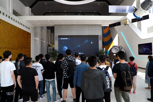 “东方红一号卫星1970年发射,是中国发射的第一颗人造地球卫星,由以钱学森为首任院长的航天五院自行研制,拉开了中国人探索宇宙奥秘的序幕。”在航天五院展厅里,参观的学子们仰头凝神,观看悬在展厅上空的“东方红一号”卫星同比例模型,聚精会神地聆听着详细生动的讲解。
