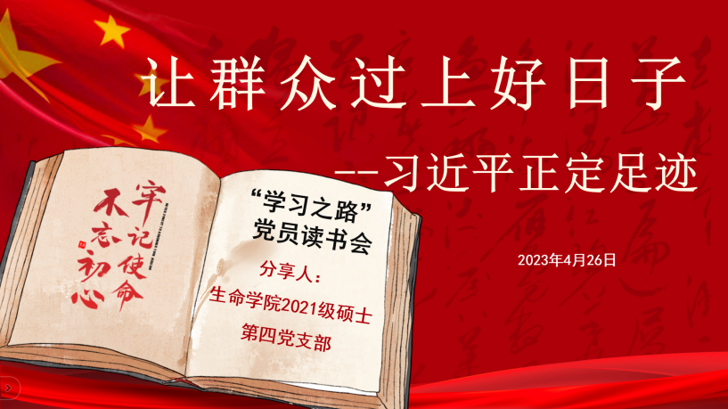 在第28个世界读书日到来之际,为营造良好学习氛围,生命学院2021级硕士第四党支部举行以《让群众过上好日子——习近平正定足迹》第三十期党员读书分享会。读书分享会由支部书记樊玥芸主持,学院党委副书记、副院长郭惠芝和全体学生党支部书记共同学习交流。