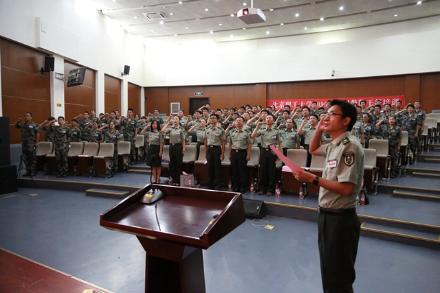 2016年军训新任指导员任峻峰代表全体军训带队干部作出承诺:要在军训工作中端正态度听指挥,树立形象严律己,安全为重树德育,以高度集中的精神为新生保驾护航。秉承“德以明理,学以精工”的校训,全身心投入到军训工作中,尽职尽责完成军训中的各项任务。