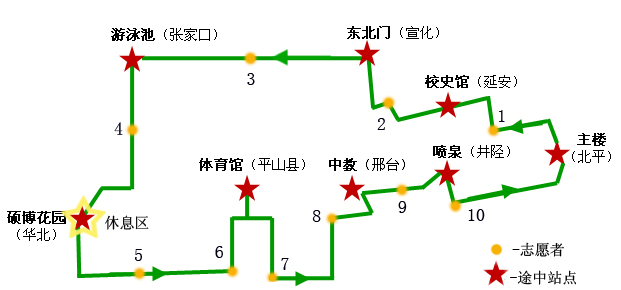 比赛全程根据我校不同时期的校址设置了北平站(主楼)、延安站(校史馆)、宣化站(东北门)、张家口站(游泳池)、华北站(硕博花园)、平山县(体育馆)、邢台站(中心教学楼)及井陉站(中心花园喷泉),共八站。将教育性和趣味性相结合,在不同站点设置了智力问答、趣味跳绳和五人六足等游戏环节,使同学们不仅锻炼了身体,同时也提高了对校情校史及“一二九运动”的认识与理解。