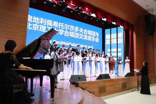 艺术周期间,我校承担了接待日本北海道大学、奥地利佩希托尔茨多夫合唱团的交流演出任务。10月18日,北理工学生合唱团在北京市第三十五中学金帆音乐厅,与日本北海道大学男声合唱团、北京汇文中学合唱团联合举办了交流音乐会。10月19日,我校学生合唱团与奥地利佩希托尔茨多夫合唱团在我校良乡校区音乐厅共同奉献了精彩唯美的合唱音乐会,同学们演绎了极富有民谣特色的“摘菜调”“半个月亮爬上来”等中国作品,同时演唱了奥地利著名音乐家海顿的音乐作品,丰富多元的演唱曲目与极具个性的演唱风格赢得了国内外师生的阵阵掌声。北理工学生合唱团以歌声为媒,在“和平、友谊、青春”的氛围里尽情歌唱,传递积极向上的精神力量。
