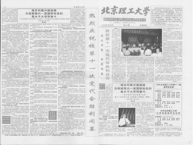 7月10日下午,在7号教学楼报告厅举行了中国共产党北京理工大学第十一次代表大会开幕式。国防科工委常务副主任徐鹏航,中国兵器装备集团总经理王德臣,中共北京市委教育工委常务副书记尹栋年、中国兵器工业集团党组成员、纪检组长杨广宏、航天机电集团党组成员、总经理助理薛利、中国兵器工业集团人劳部主任樊友山、中国兵器装备集团人力资源部主任陈遂申等上级领导和我校部分老领导出席了大会。大会开幕式由杨宾同志主持。焦文俊同志代表第十届党委会作题为《落实科教兴国战略,为创建国内一流、国际知名的高水平大学而奋斗》的工作报告。报告回顾了第十届党委四年来的工作,总结了党委抓住机遇,深化改革,促进发展所取得的主要成绩,总结了四年来党的建设和思想政治工作的显著进步,特别总结了不久前刚结束的“三讲”教育的收获,概括总结了学校改革发展建设的基本经验。报告提出建设“国内一流、国际知名”高水平大学的宏伟目标和今后几年的主要任务,以及加大改革力度,加快发展,走“跨越式”发展道路的措施。报告的第三部分提出以“三个代表”的重要思想为指导,凝聚全校力量,全面加强党的建设的方针和任务。张敬袖同志代表纪律检查委员会作了题为《围绕中心,服务全局,从严治党,努力开创我校纪检监察工作的新局面》的工作报告。匡镜明校长作了题为《抓住机遇,深化改革,走跨越式发展道路,全面完成我校“十五”发展建设目标》的工作报告。代表们认真听取了报告,并不时报以热烈掌声。